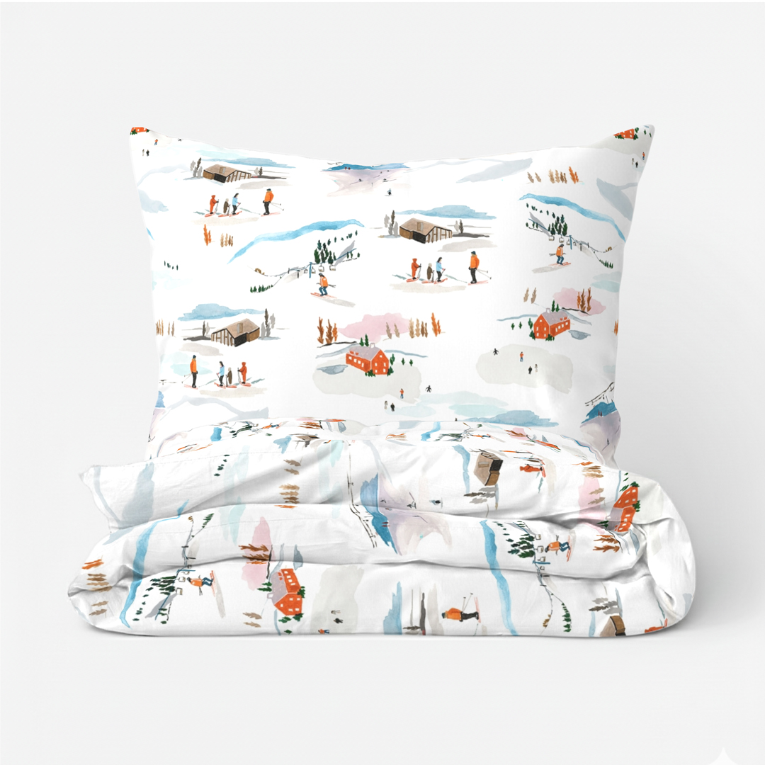 Luxusní vánoční povlečení TIRON vás během chvíle přenese do zasněžených hor. Jemné ilustrace lyžařů, horských chat a zimních svahů v tlumených tónech vytvářejí klidnou atmosféru, která působí čistě a elegantně. Materiál z egyptské bavlny v úpravě Mako Jersey je pružný, nemačkavý a hřejivý, ideální pro chladné zimní noci. Skvělá volba pro milovníky minimalismu, kteří chtějí své ložnici dodat zimní eleganci.
