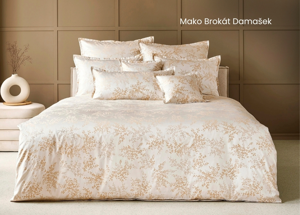 Mako Brokát Damašek je výjimečná tkanina, která spojuje noblesu tradičního Damašku s luxusem třpytivého brokátu. Jde o hustou, pevnou tkaninu ze vzácné Mako bavlny, jejíž specifický vzor vzniká tkaním na žakárovém ústrojí – motiv je tak vetkaný přímo do struktury látky a jemně kontrastuje s podkladem. Charakteristické je střídání osnovních a útkových nití, kdy je na povrchu vždy viditelná pouze jedna z nich, což vytváří efektní hru matných a lesklých ploch. Celkový dojem pak povyšuje decentní třpyt brokátu, který dodává materiálu slavnostní hloubku a nádech skutečného luxusu.