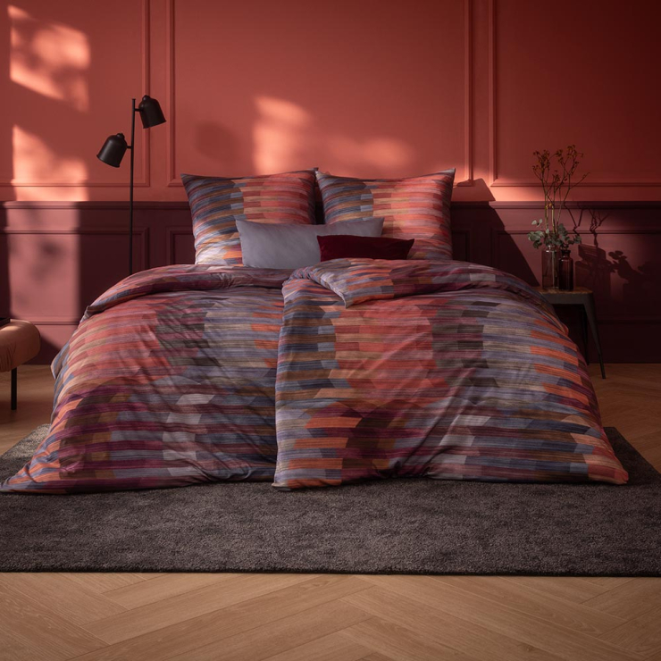 Geometrické motivy v tónech červené, fialové a terakoty působí jako poslední paprsky dne. Pokud chcete do ložnice dostat hřejivost, klid a jemnou energii, povlečení AURI vytvoří příjemný večerní rituál.