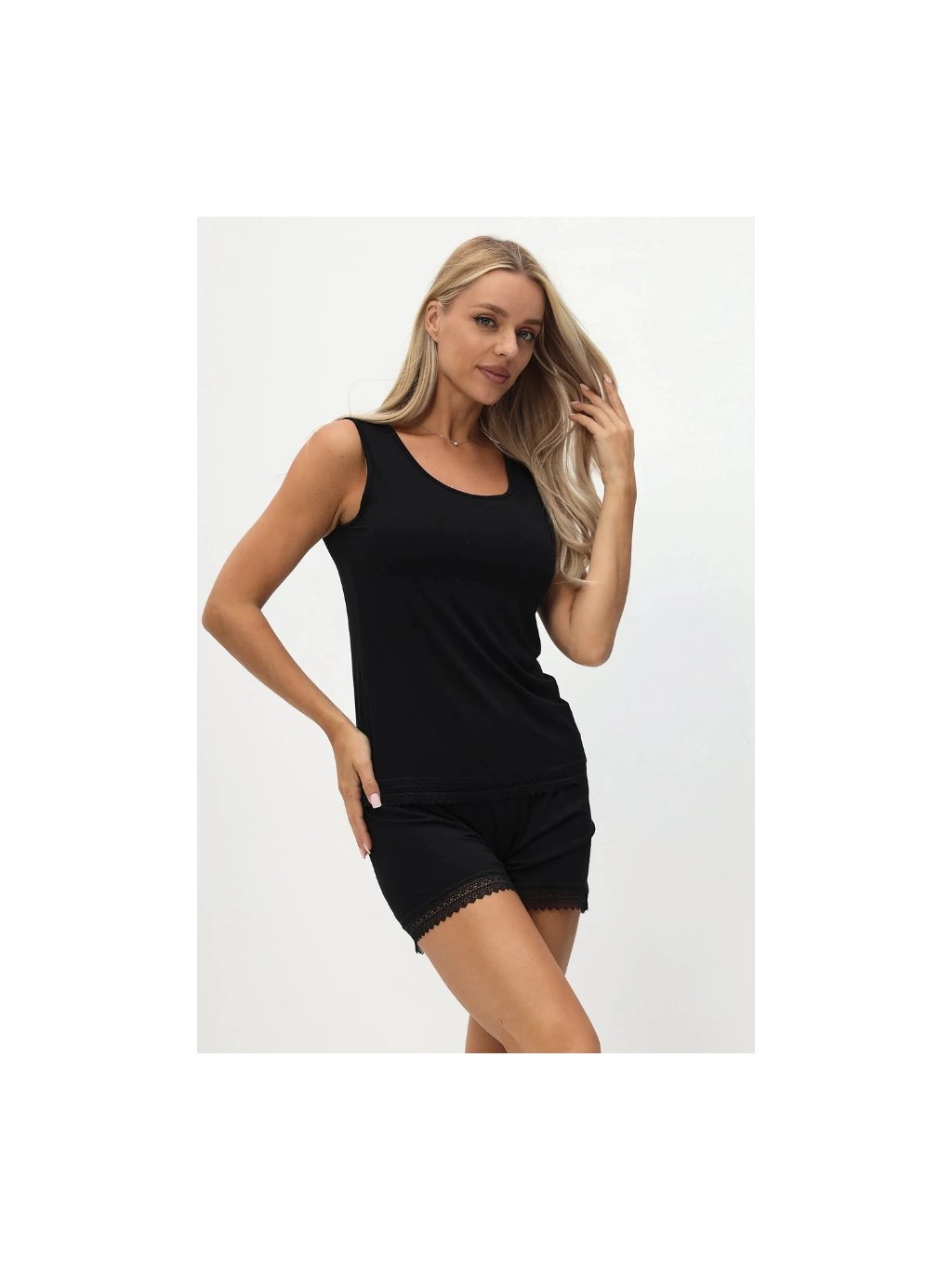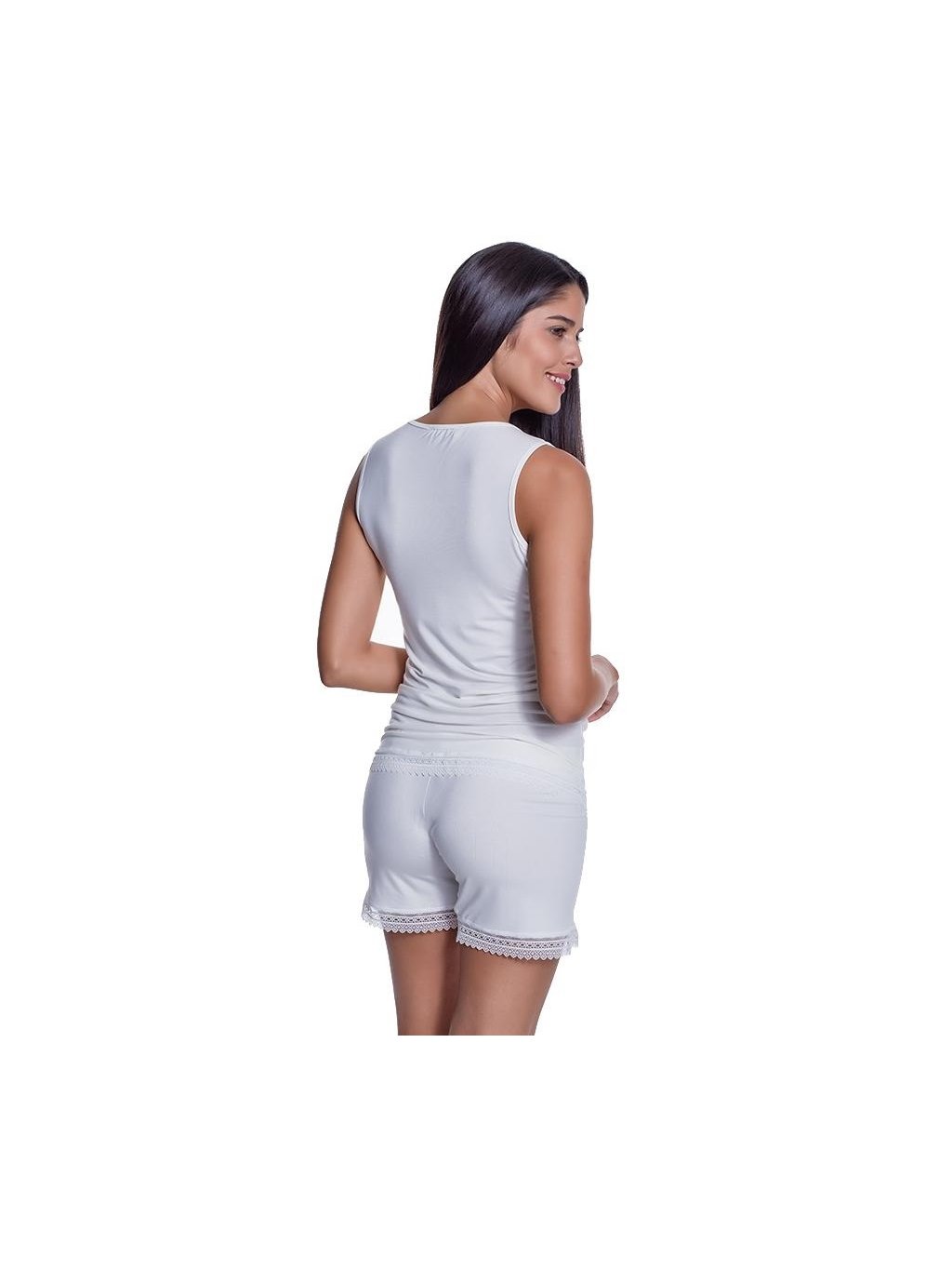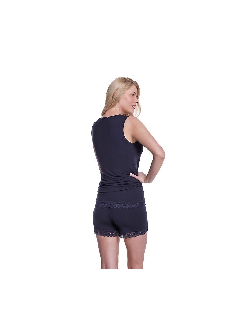 Bambusové pyžamo ANNIE v barvě krémové nebo černé si můžete objednat ve velikostech S, M, L a XL. Při výrobě bylo použito 100% bambusové vlákno s antibakteriální a hypoalergenní úpravou. Ideální materiál zejména pro dívky a ženy, které trápí citlivá pokožka. Střih je pohodlný, ramínka široká. Šortky zdobí jemná kraječka.