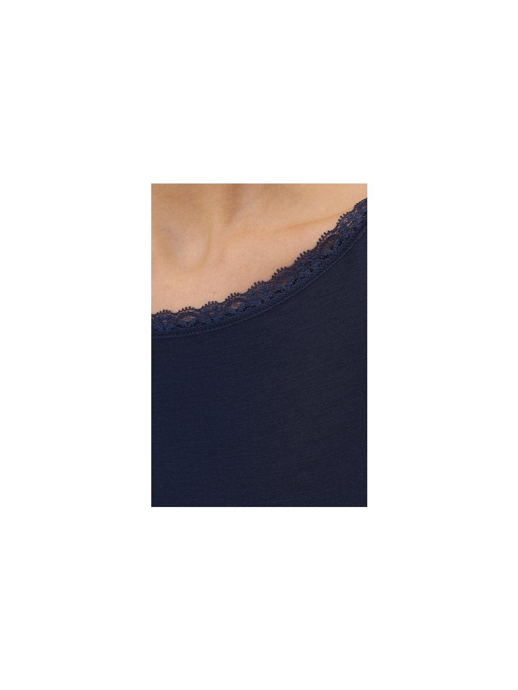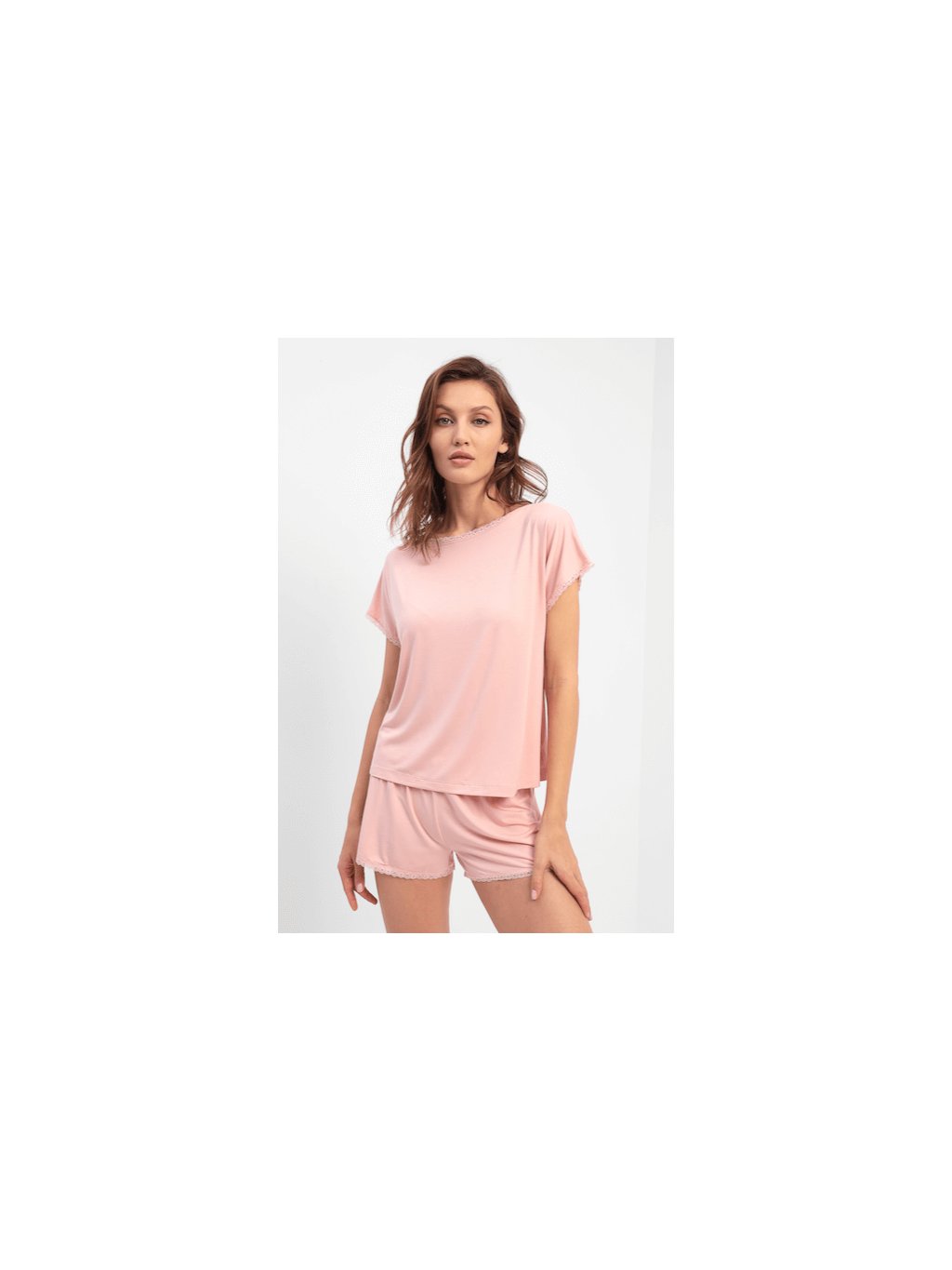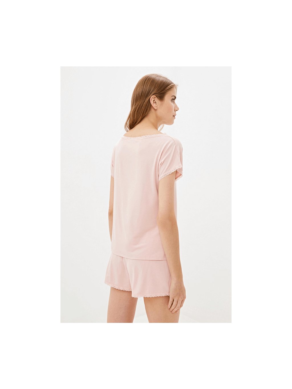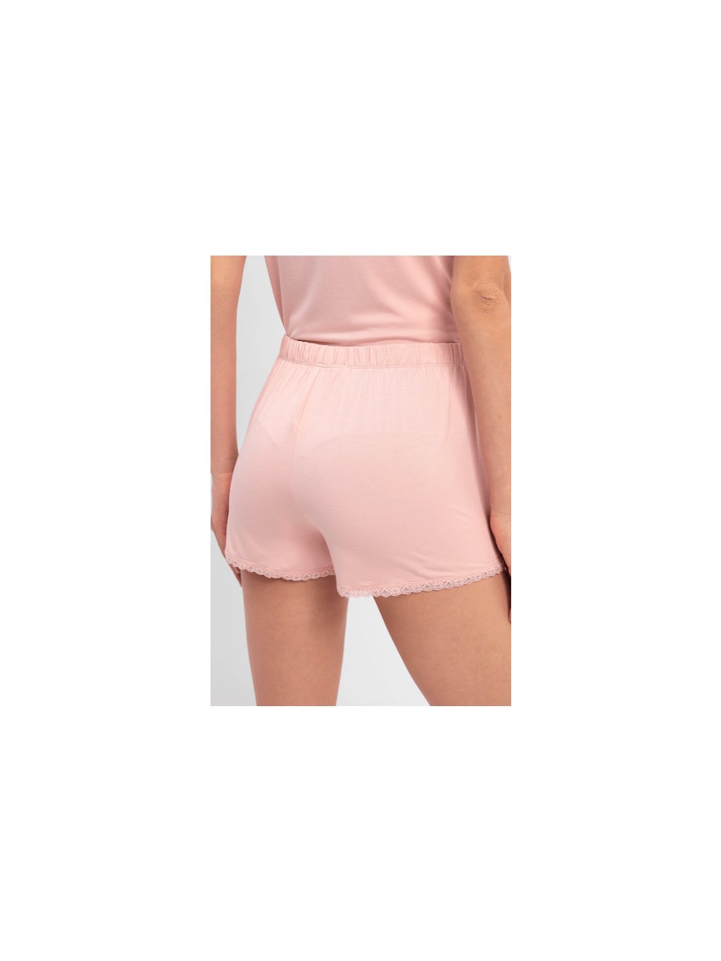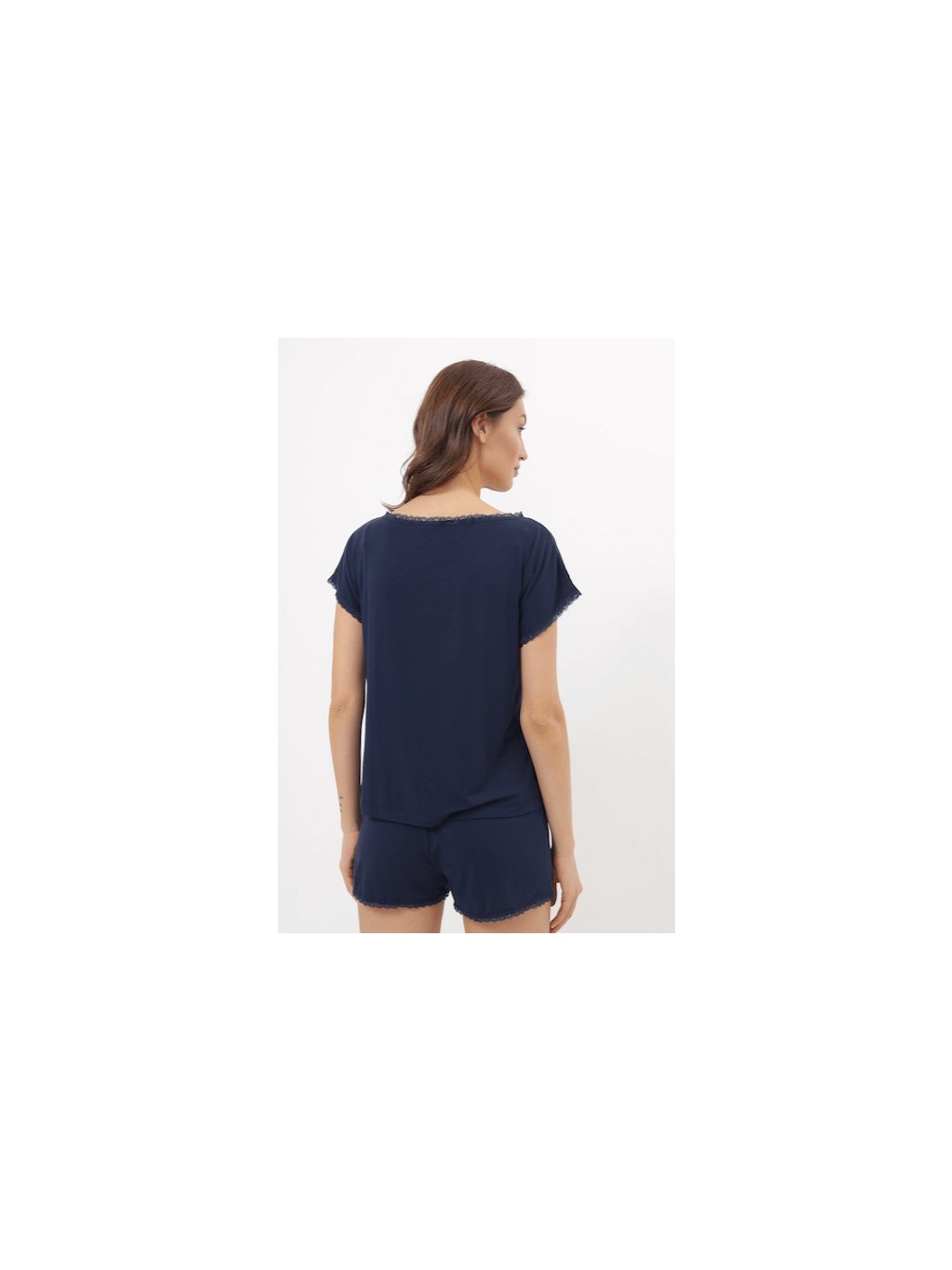 Toto dvojdílné pyžamo je zakončeno na krátkých rukávech, kraťasech a ve výstřihu jemnou krajkou. K dostání v barvě růžové a tmavě modré.