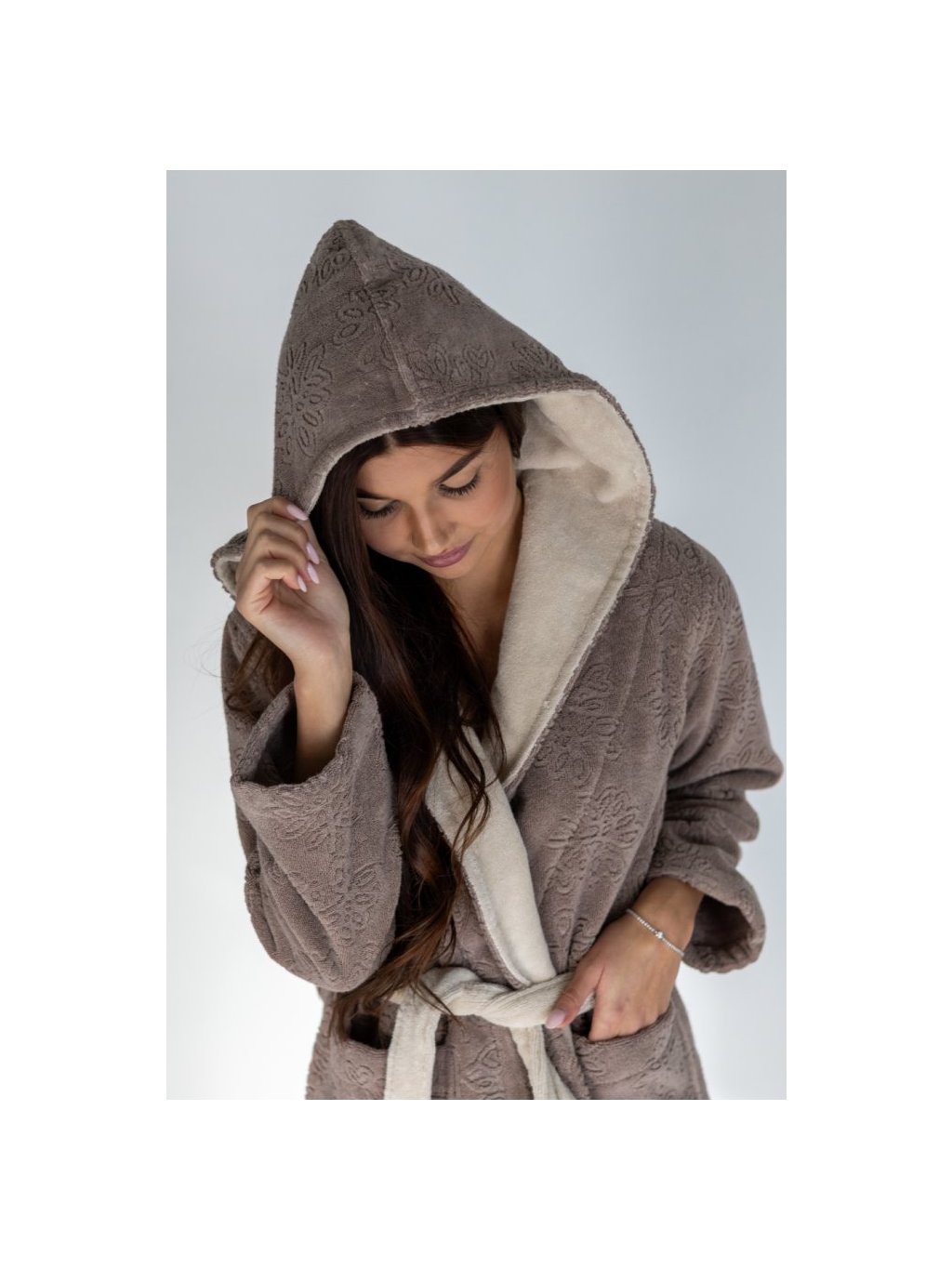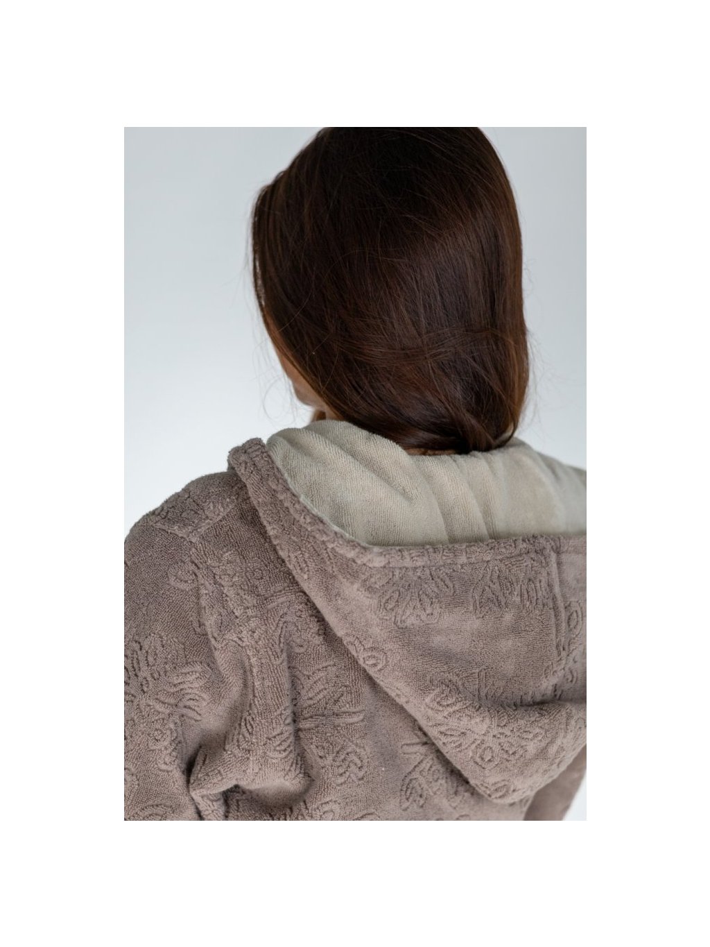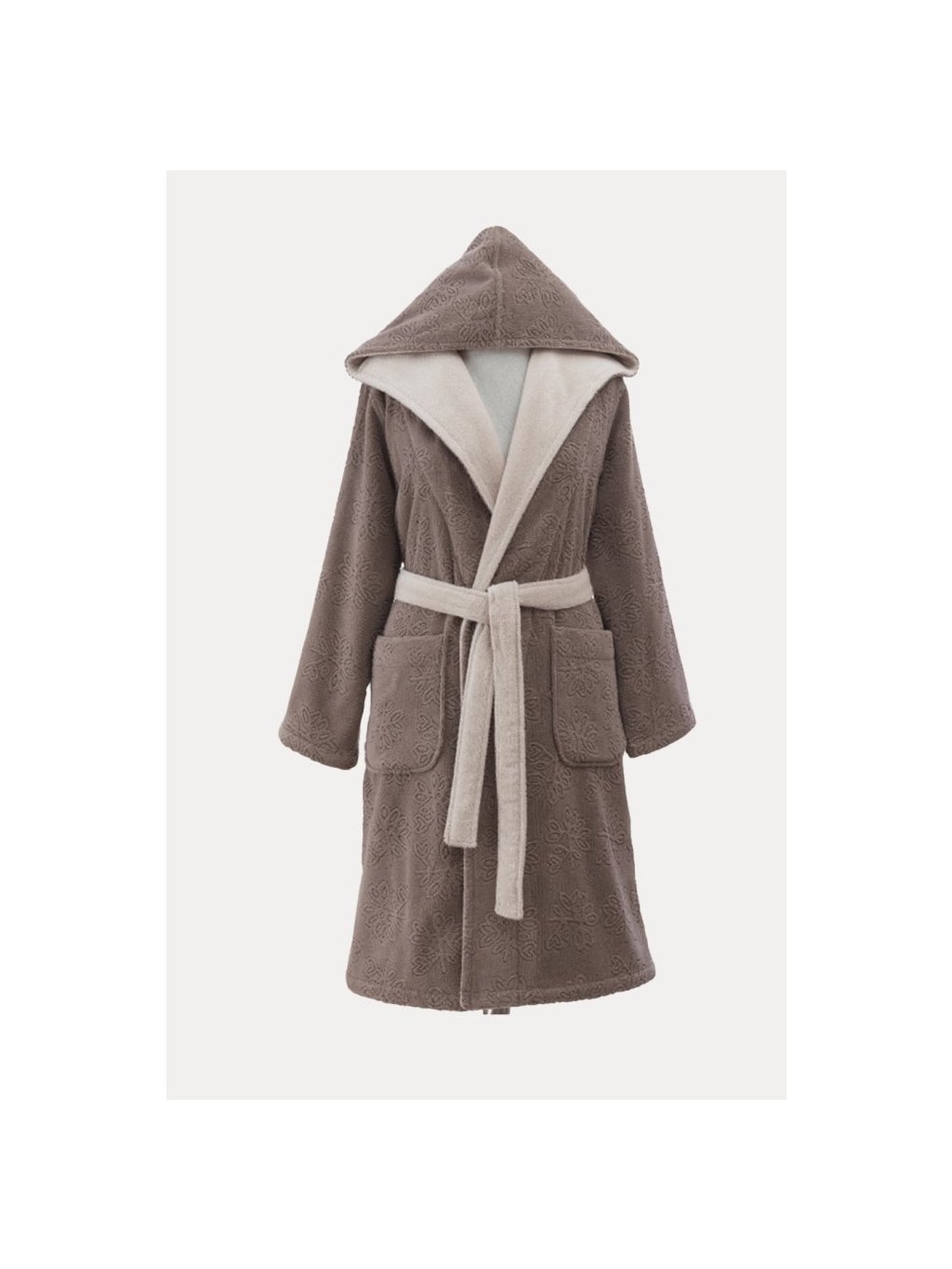 Hnědý dámský župan LEAF si můžete pořídit ve velikost S, M a L. Je hřejivý, výborně saje vlhkost a zahalí celou vaši postavu, neboť má kapuci a je vyrobený ze 100% česané bavlny.