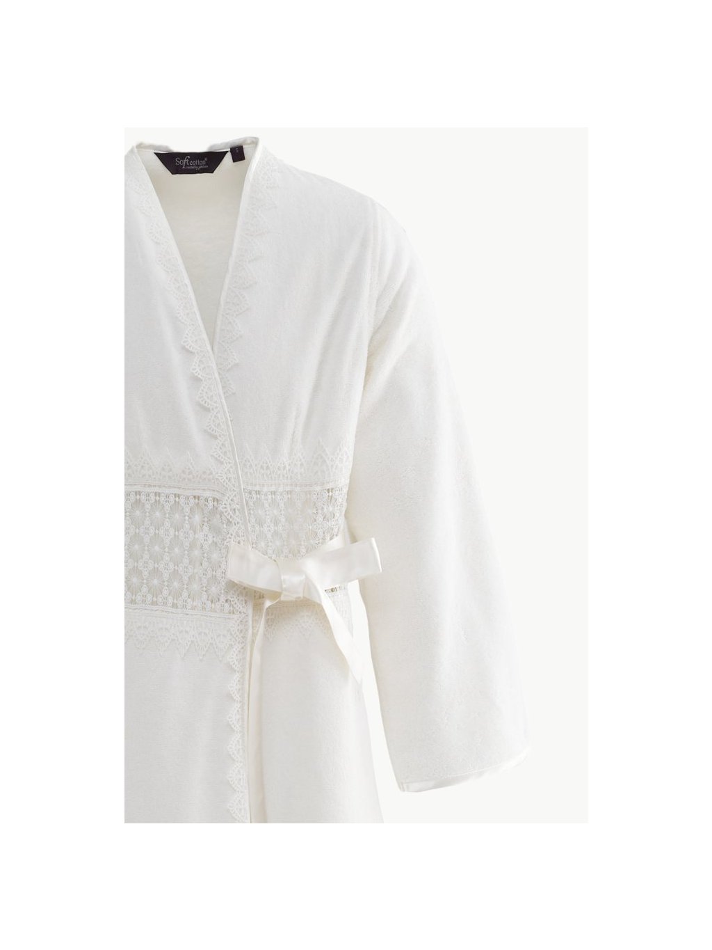 Župan: Kimono střih, zdobený průhlednou krajkou v pase a lemovaný saténovou stuhou. Gramáž 420 g/m². Dostupný ve velikostech S, M, L, XL. Barva: smetanová.