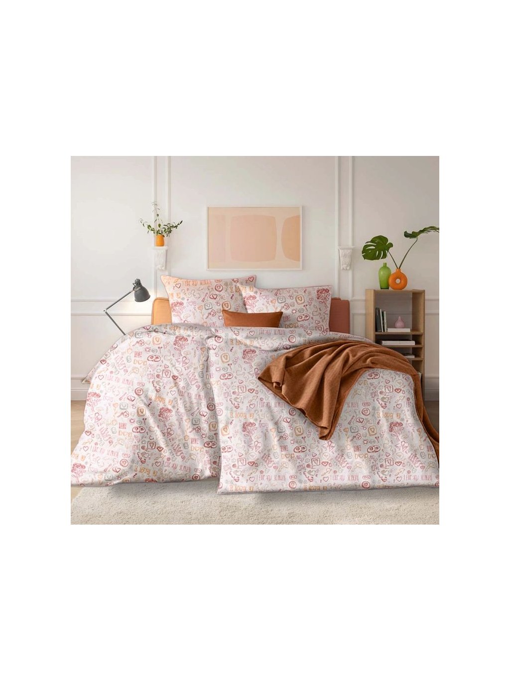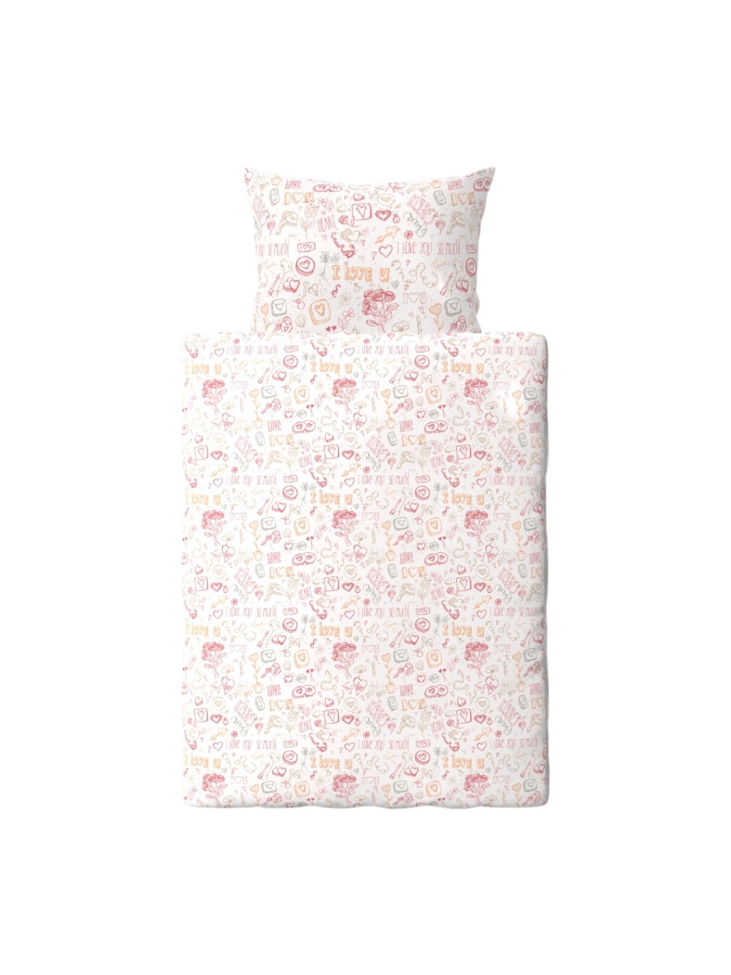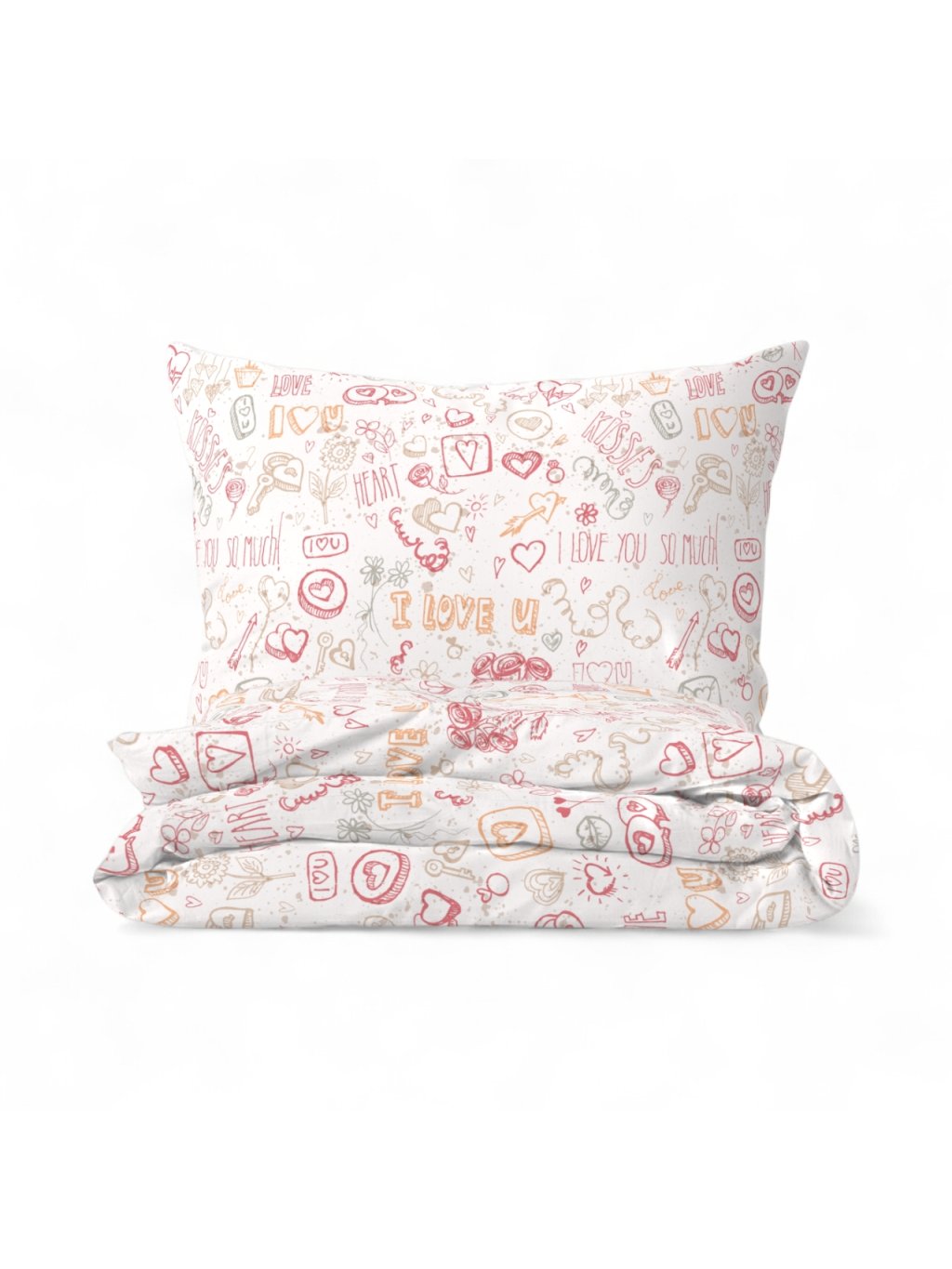 Povlečení LOVE NOTES okouzlí svou jemností a lehkou romantikou. Decentní vzor drobných symbolů lásky, písmen a srdíček v tlumených tónech pudrové růžové, béžové a šedé působí elegantně a klidně, ideální pro harmonickou a útulnou ložnici.