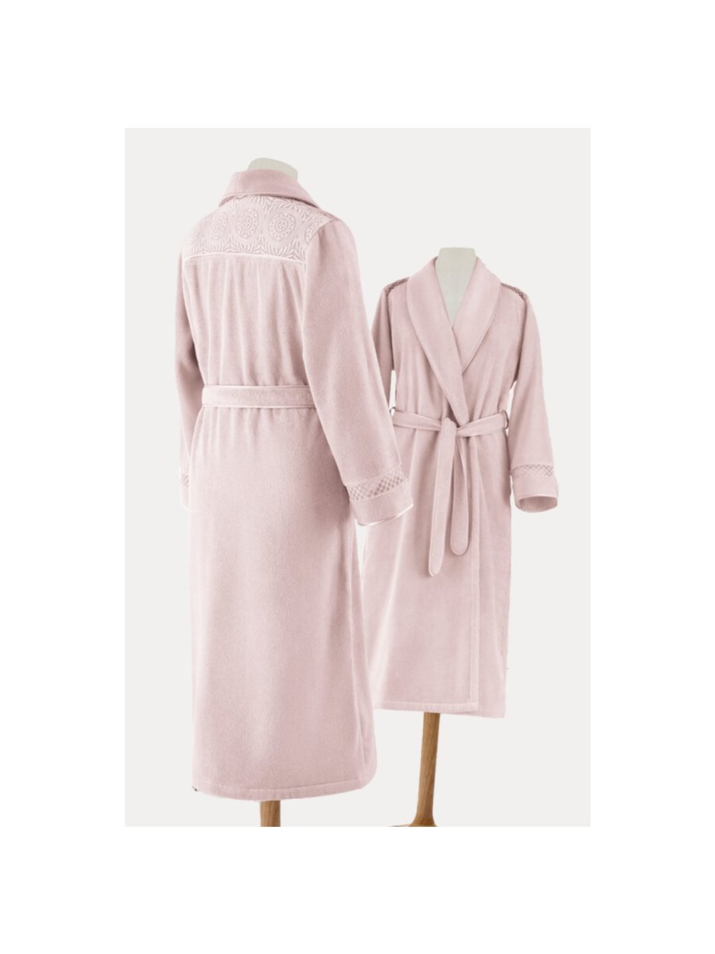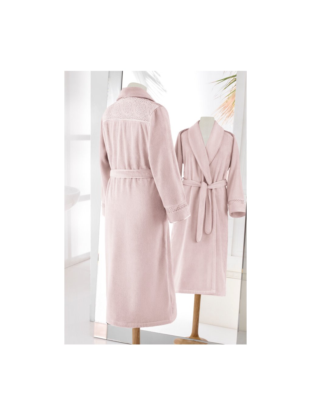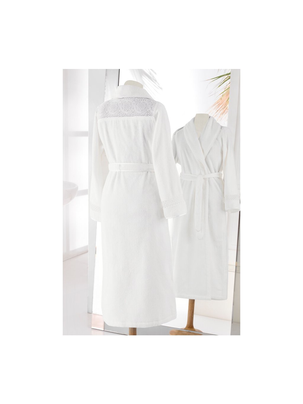 Antibakteriální úprava MICROBAN zabraňuje množení bakterií, což zajišťuje hygienickou čistotu županu a jeho šetrnost k citlivé pokožce. Dokonalý střih se šálovým límcem, dlouhými rukávy a praktickým páskem zajistí maximální pohodlí při nošení. Jemná krajka na ramenou a rukávech dodává županu nádech luxusu a podtrhuje jeho ženský půvab.