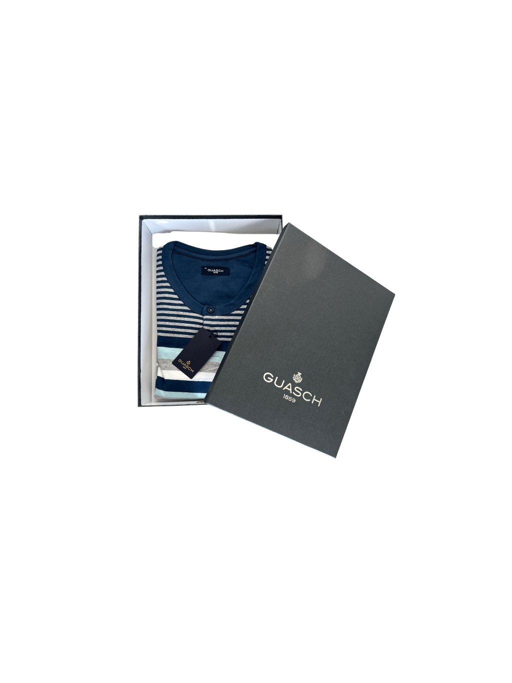 Horní díl, to jsou drobné modré a bílé proužky na šedém podkladu. U výstřihu najdete zapínání na malé knoflíčky.