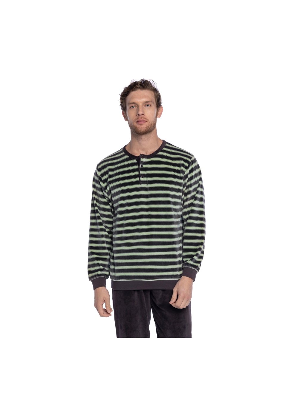 Vrch pyžama je zdoben pruhy, které dodávají celému oblečení unikátní vzhled. Kalhoty jsou pak v krásném hnědém odstínu. Tento detail zvyšuje vaši stylovost i ve chvílích odpočinku.