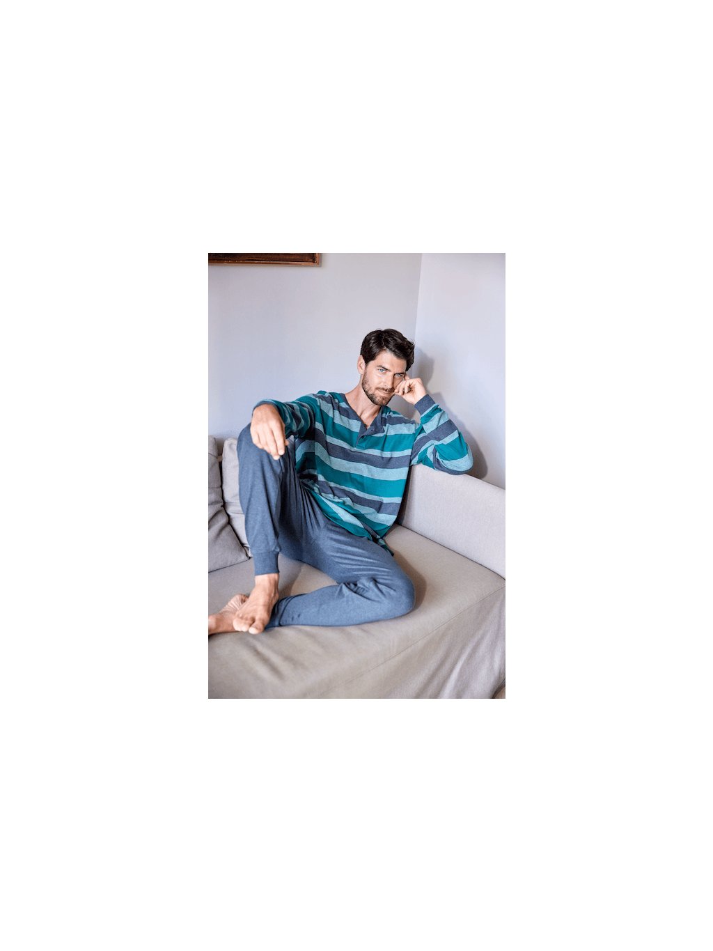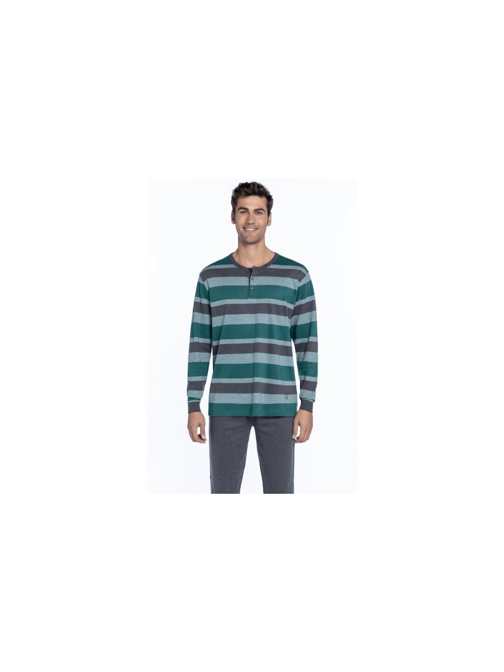 Na tomto pyžamu muži ocení zejména kvalitní materiál, pohodlí a snadnou údržbu. Pánské pyžamo s dlouhým rukávem SANTOS je ze 100% bavlny. Nohavice jsou jednobarevné, tmavomodré u výstřihu najdete zapínání na malé knoflíčky.