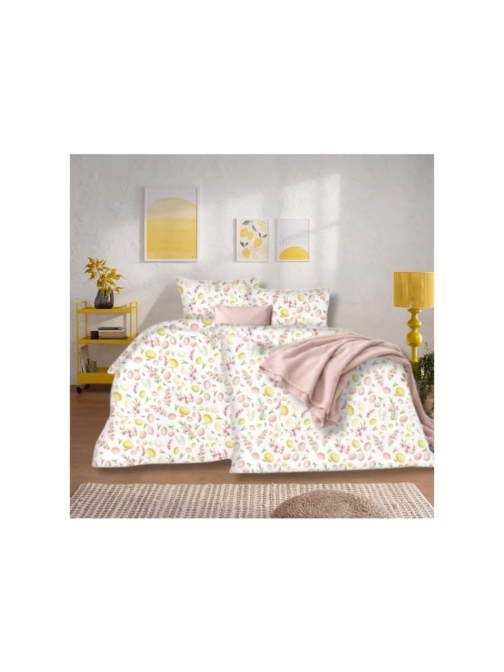 Jemné a hravé povlečení EGGSY s něžným jarním motivem vajíček, květin a lístků, vnese do vaší ložnice svěžest a lehkost. Pastelové tóny v kombinaci s elegantním designem působí uklidňujícím dojmem a skvěle doladí velikonoční i jarní atmosféru.