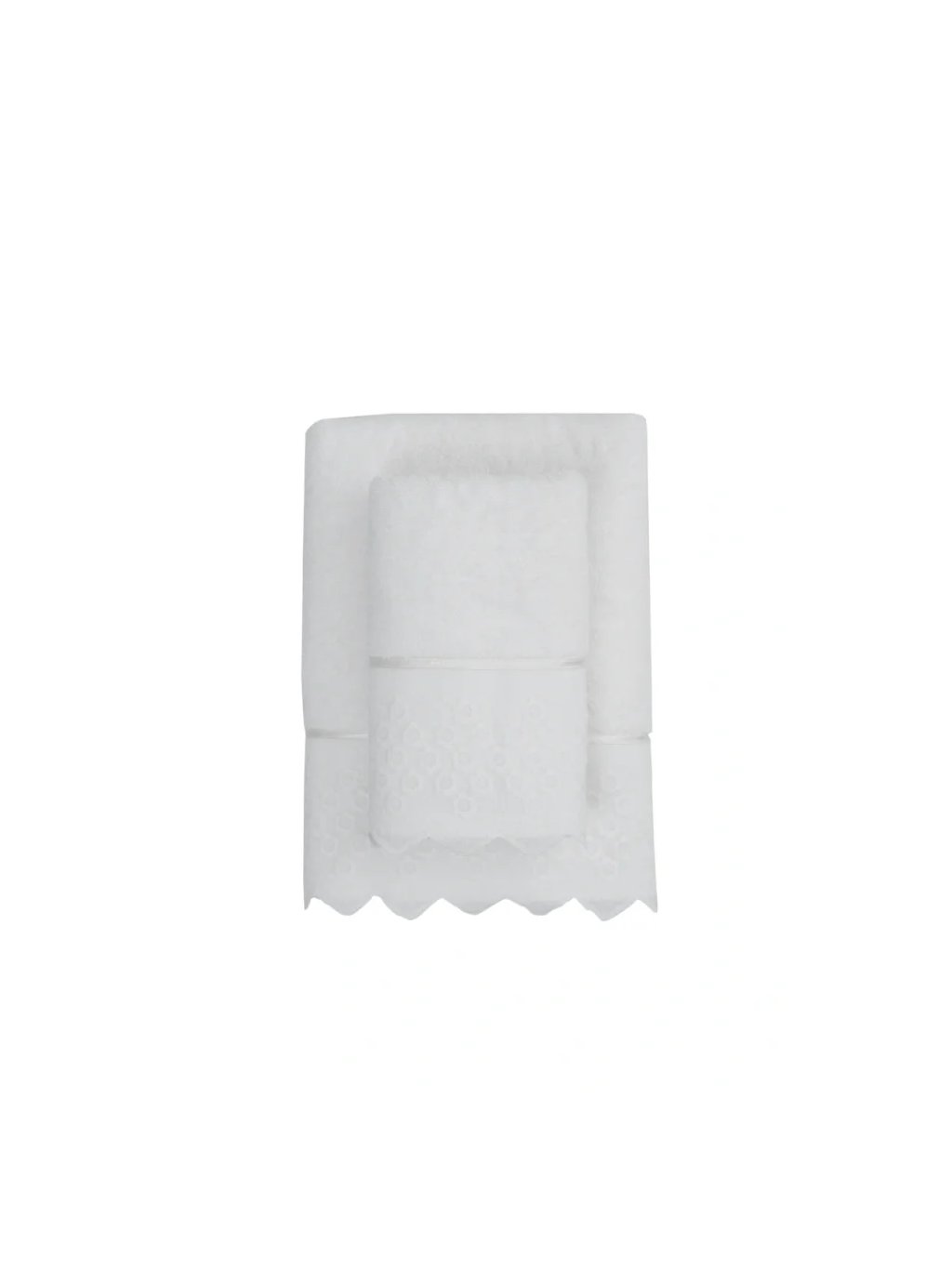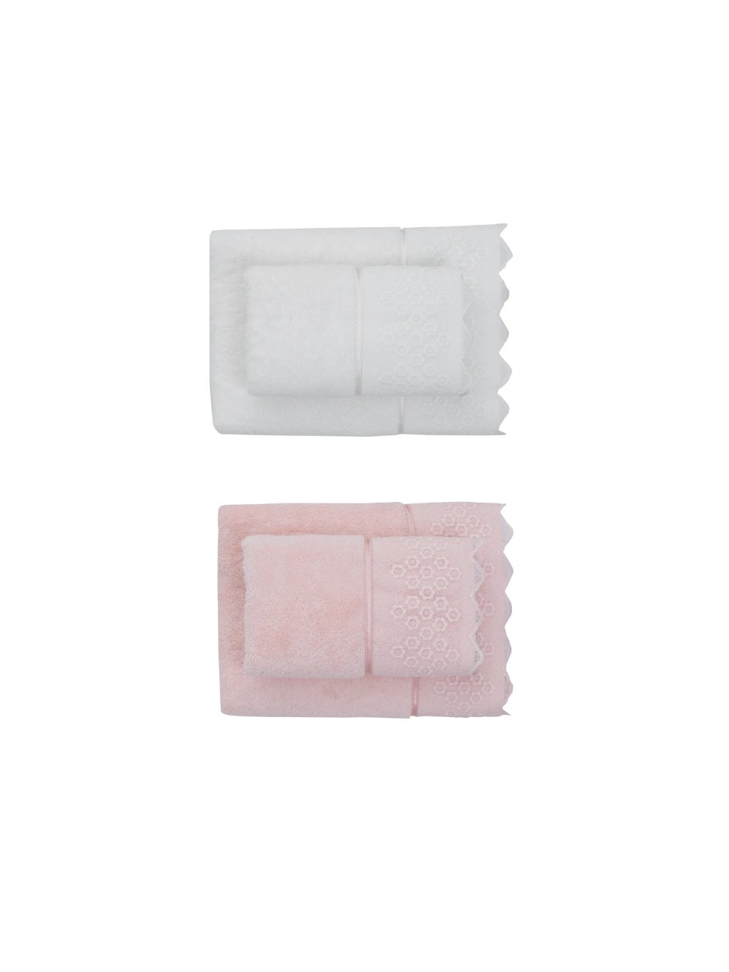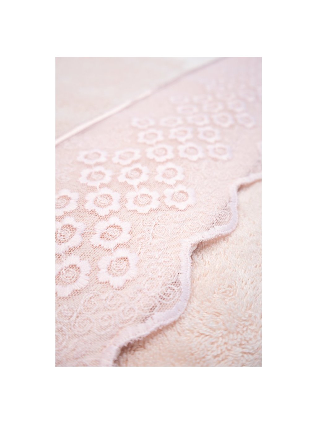 Tato sada, zabalená v elegantní krabici, je dostupná ve dvou půvabných barevných variantách – smetanové a růžové – a je ozdobena jemnou krajkou, která ručníkům dodává nádech luxusu a ženství.