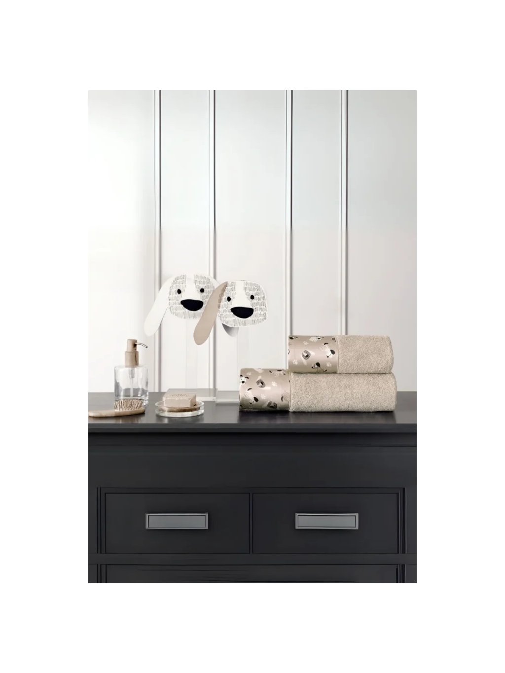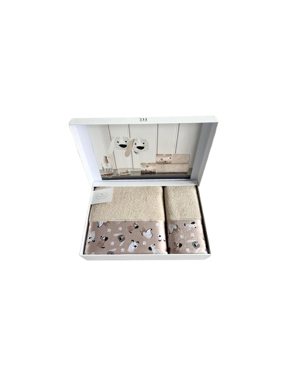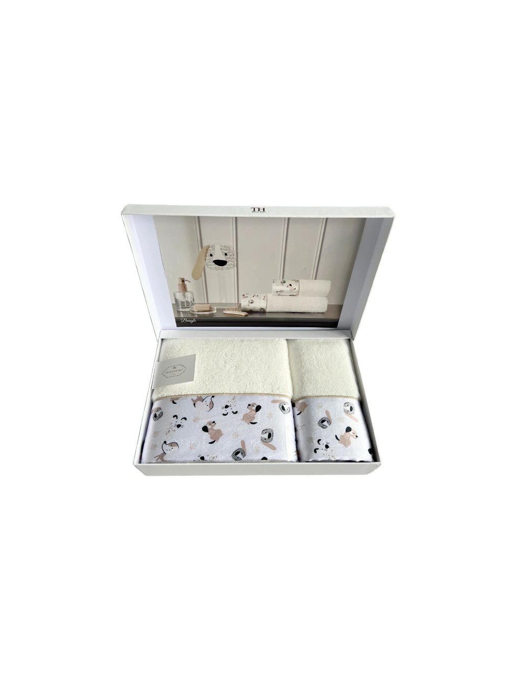 Sada obsahuje ručník 50x100 cm a osušku 75x150 cm zabalené v krásném dárkovém boxu. K dispozici je ve dvou barevných variantách – béžové a bílé. Ručníky zdobí hravá bordura s motivem pejsků, která přináší do každodenní hygieny zábavu.