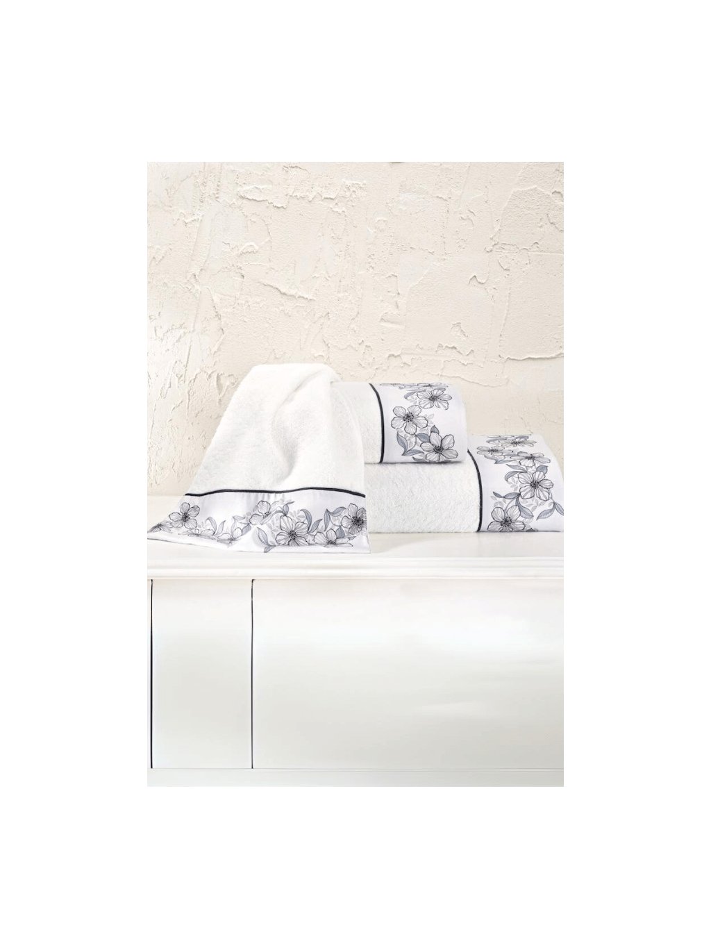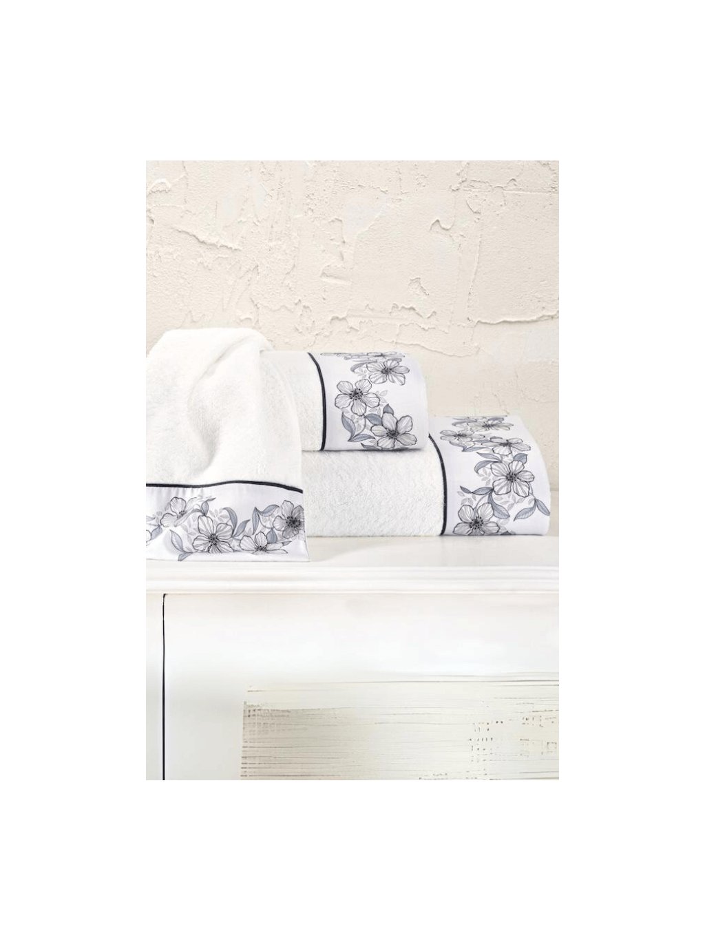Tato luxusní sada obsahuje tři kusy ručníků různých velikostí (30x50cm, 50x100cm, 75x150cm) v elegantní bílé barvě s jemnou květinovou bordurou. Každý kus je vyroben z kvalitní 100% bavlny o gramáži 550 g/m2, což zaručuje vysokou absorpci a trvanlivost. Materiál je příjemný na dotek, což zajišťuje komfortní použití.