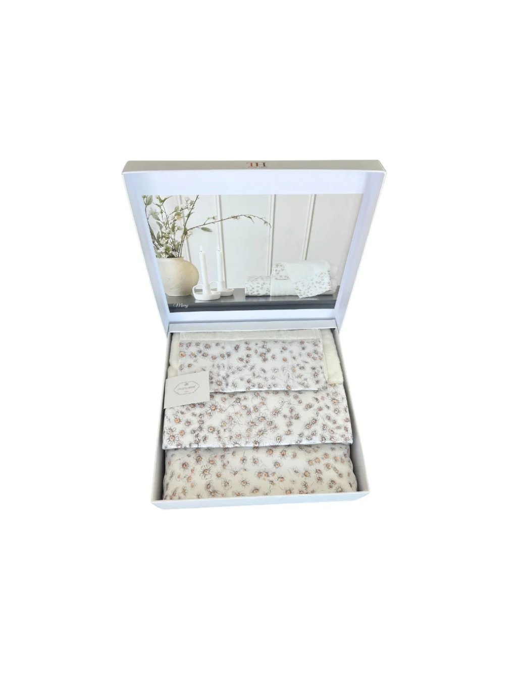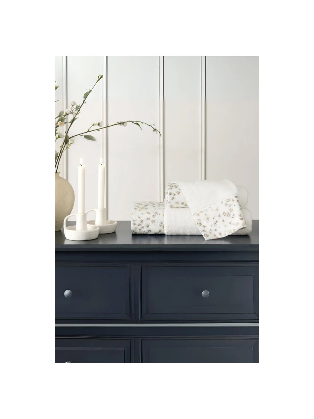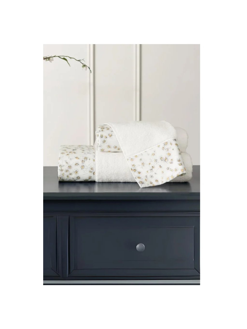 Sada obsahuje malý ručník o rozměru 30x50 cm, střední ručník 50x100 cm a velkou osušku 75x150 cm. Na okrajích ručníků a osušky je krásná bordura zdobená motivem sedmikrásek, což dodává celé sadě jemný a romantický vzhled. Ideální nejen pro každodenní použití, ale také jako luxusní dárek.