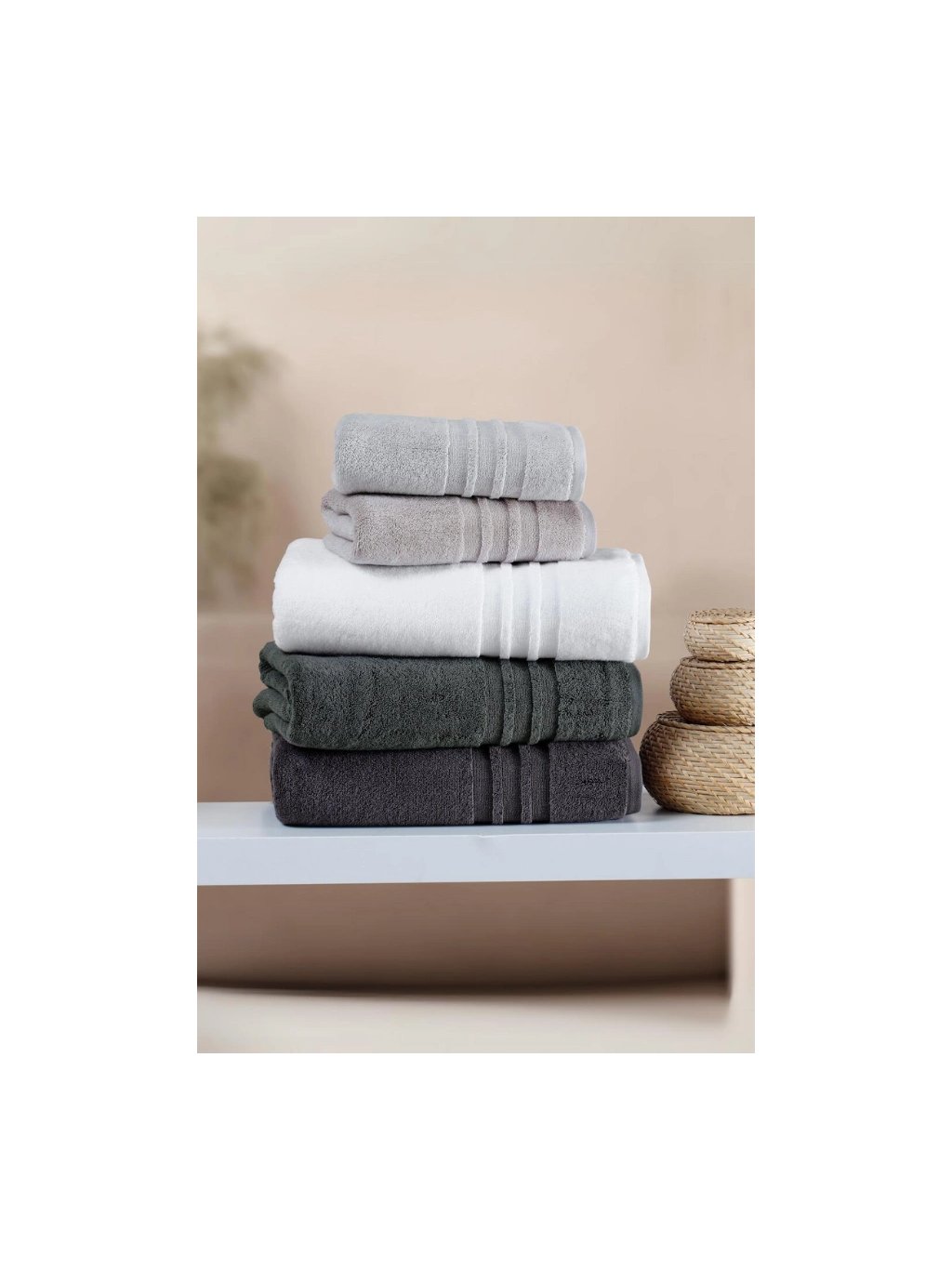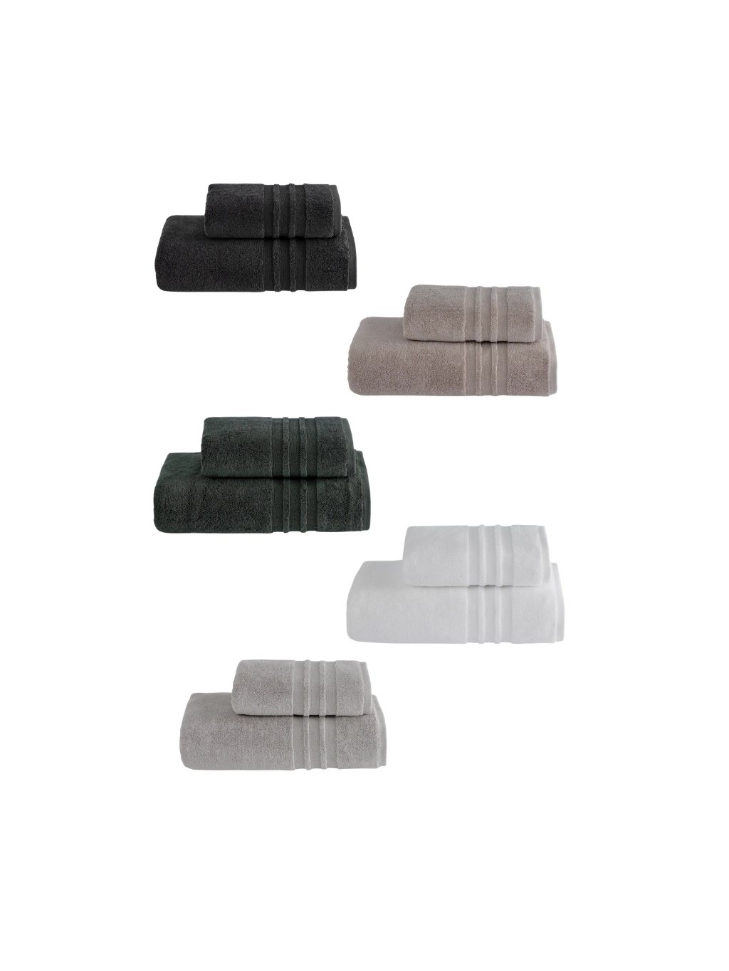Set obsahuje ručník o rozměru 50 x 100 cm a osušku 85 x 150 cm. Obě jsou opatřeny antibakteriální ochranou MICROBAN, která udržuje svěžest i při častém používání. Dostupné varianty barev: bílá, khaki, černá antracit, světle béžová a světle šedá.